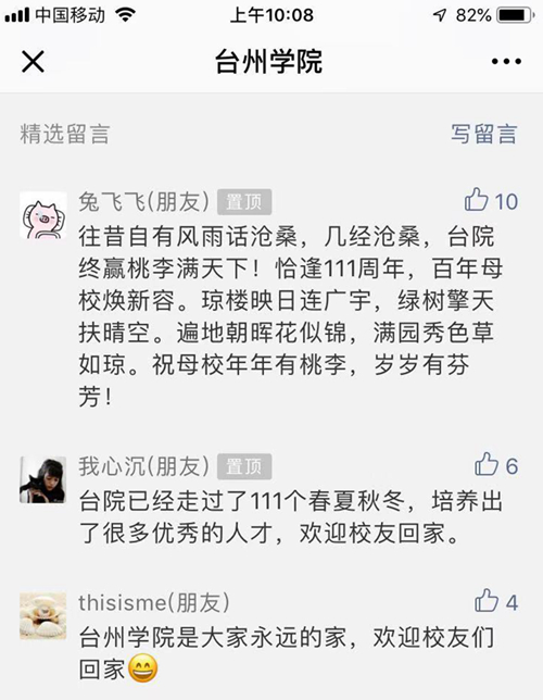 “这是属于台州学院人的欢乐夜!学校第一次举办校友返校日活动,得到了这么多校友的关注,令人吃惊也令人感动!”校友会工作负责人说,为了方便校友来校和便于记忆,我们将每年12月份第二个星期的星期六作为校友返校日的固定日期,希望校友们常回家坐坐,见证母校日新月异的新变化、新面貌。接下来,我们将以台州学院校友会和台州学院校友基金会为平台,团结凝聚广大校友力量,以“升硕升格创一流”为引领,助力学校早日驶入跨越式、内涵式、高质量发展的快车道。