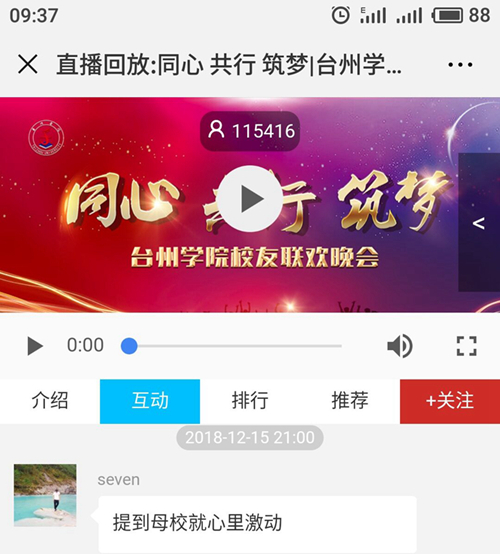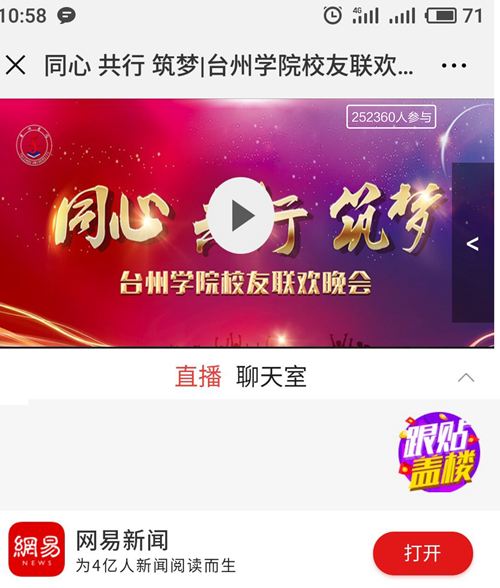 与此同时,停在音乐厅外的视频直播车,已经将现场的晚会盛况通过视频直播的方式,在“无限台州”“网易视频”等网络直播平台进行直播,让广大未能到校的校友和学校师生也同步感受到了校友之夜的无限深情和四射魅力。据统计,当天晚上通过手机、电脑在“无限台州”“网易视频”观看校友联欢晚会,分别突破11万和25万人次。很多校友在视频直播互动区,纷纷写下“祝福母校”“为台院打call”“台院明天更美好”的留言;还通过台州学院公共微信号、台州学院校友会公众微信号转发观看晚会视频并写下“祝母校年年有桃李,岁岁有芬芳”“台州学院是大家永远的家,欢迎校友回家”“好久没有回去看看了”的留言,发自肺腑,动情感人。