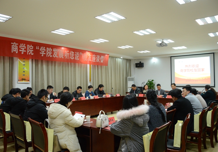 共话同窗深深情谊,共图母校发展大计。当天下午,商学院召开“学院发展听您说”校友座谈会。院长杜才平,党总支书记周全宝,副院长尹兰香、刘际陆,全体辅导员、教师代表及20多位校友出席会议;学院党总支副书记鲍婷婷主持。