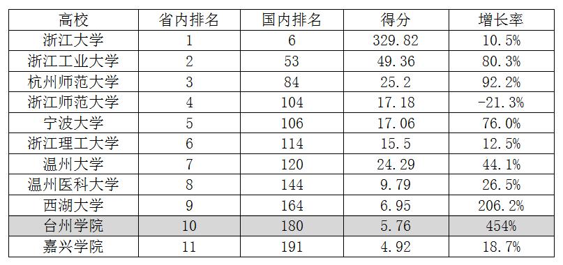 2020年度自然指数中国内地高校TOP200中浙江省高校排名