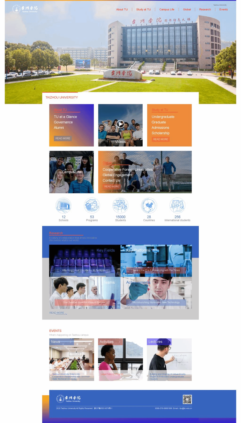 经过半年多的反复研讨论证、设计修改、制作调试,正式上线后的英文网站2.0版本,以台州绿、学院蓝、活力橙为主色调,开设“About TU”“Study at TU”“Campus Life”“Global”“Research”“Events”菜单栏,辅以大量色彩明快、风格显著的图片,凸显网站的国际性、时尚感、实用性。