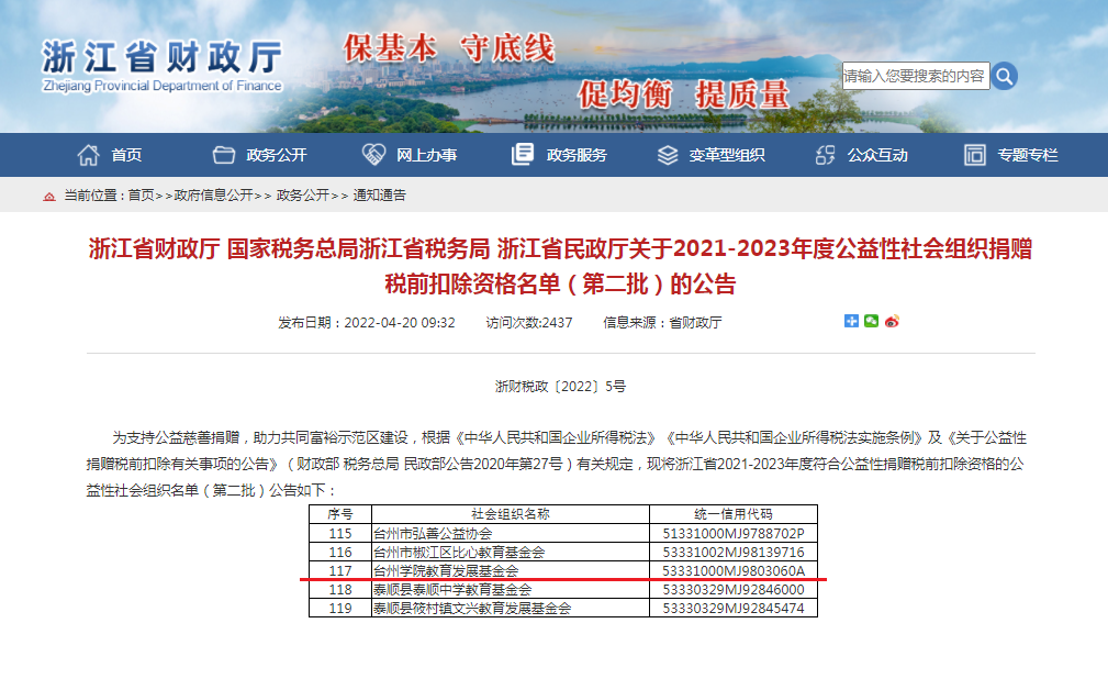 日前,浙江省财政厅、省税务局、省民政厅联合发布《关于2021-2023年度公益性社会组织捐赠税前扣除资格名单(第二批)的公告》,台州学院教育发展基金会名列其中,获得2021-2023年度公益捐赠税前扣除资格。