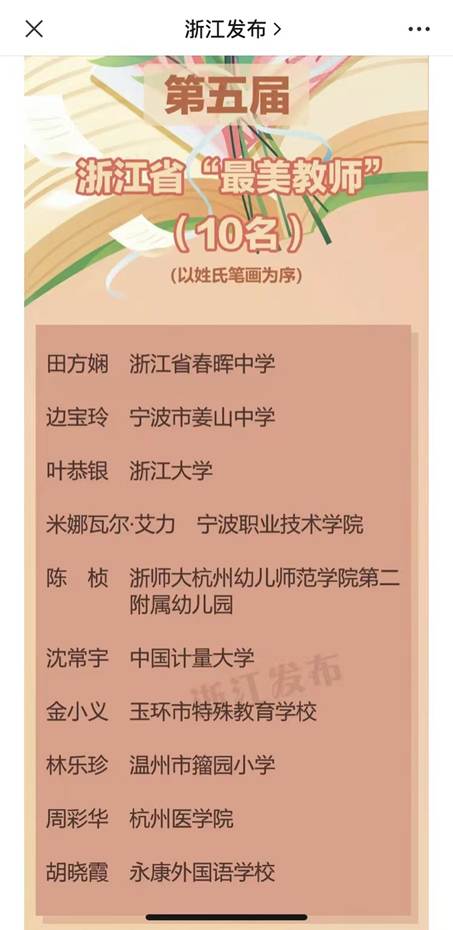 据悉,浙江省“最美教师”每2年评选一次,第五届选树活动自今年4月启动,最终选树了10名“最美教师”和20名提名奖获得者。