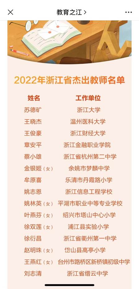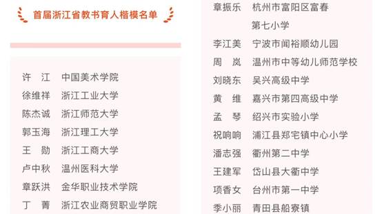 据悉,浙江省杰出教师每3年评选一次,迄今已评选出9批(含省功勋奖教师),本次获奖人选15人。
