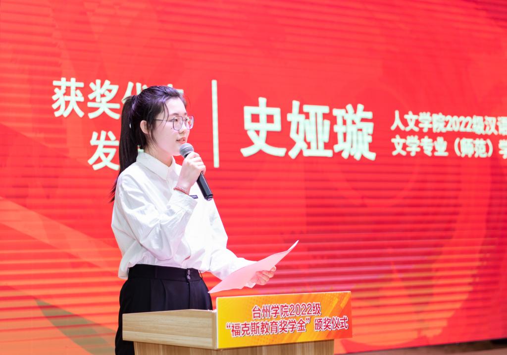 来自2022级中文教育1班的史娅璇同学是我校今年在山东省录取分数线最高的学生。她作为获奖学生代表发言,表达了对学校和福克斯集团、台州市山东商会的感谢,号召同学们心怀感恩,勤奋刻苦,用实际行动回报母校、回报家乡、回报社会。