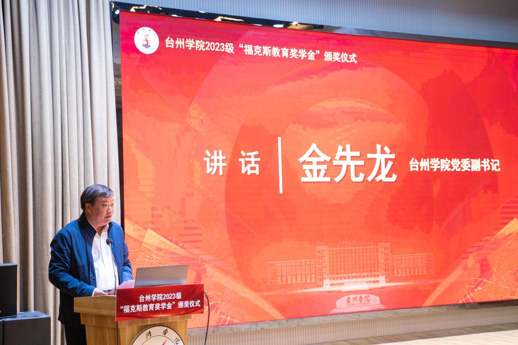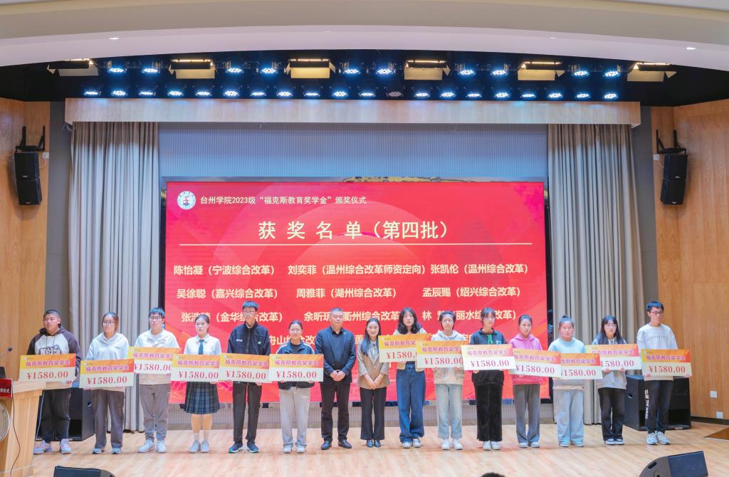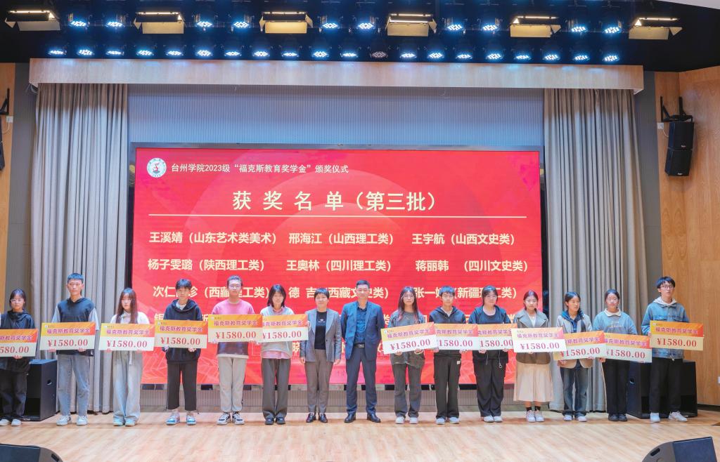 11月9日下午,我校2023级“福克斯教育奖学金”颁奖仪式在椒江校区学生活动中心举行,2023级共63名学生获得表彰。校党委副书记金先龙,浙江福克斯教育科技有限公司董事长胡跃兵,浙江省山东商会副会长、台州市山东商会创会会长朱建伟出席仪式并为获奖学生颁奖,校相关职能部门、二级学院负责人参加仪式;校地方合作处处长、台州学院教育发展基金会理事长姚俊主持仪式。