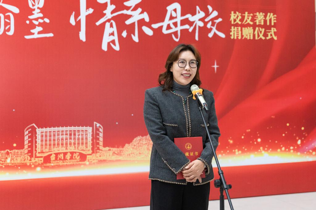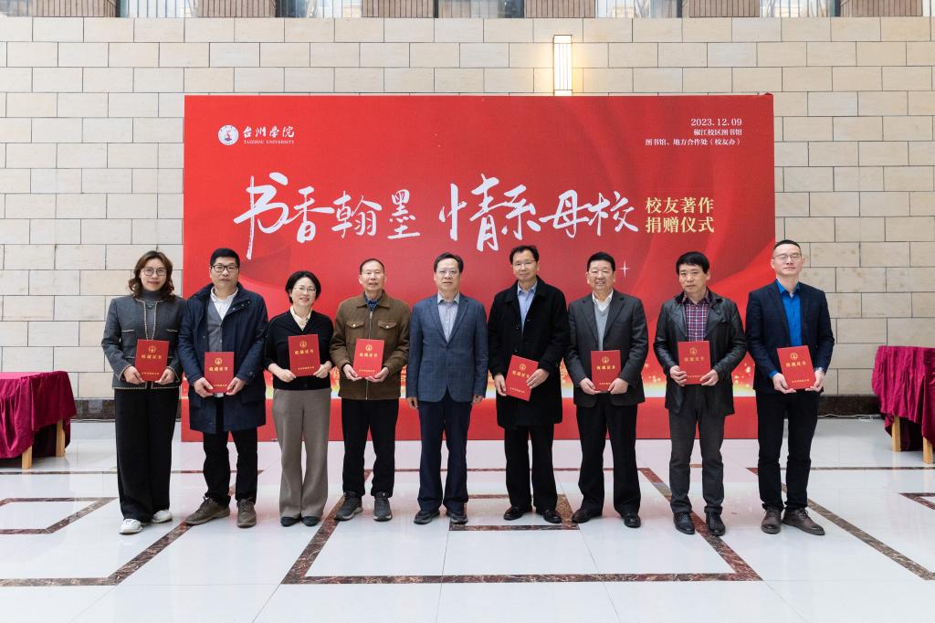 12月9日上午,台州学院“书香翰墨 情系母校”校友著作捐赠仪式在椒江校区图书馆隆重举行,校党委副书记潘通天出席并为捐赠者颁发收藏证书,优秀校友代表、地方合作处(校友办)与图书馆相关负责人及师生代表50余人参加,仪式由图书馆党总支书记王凌主持。