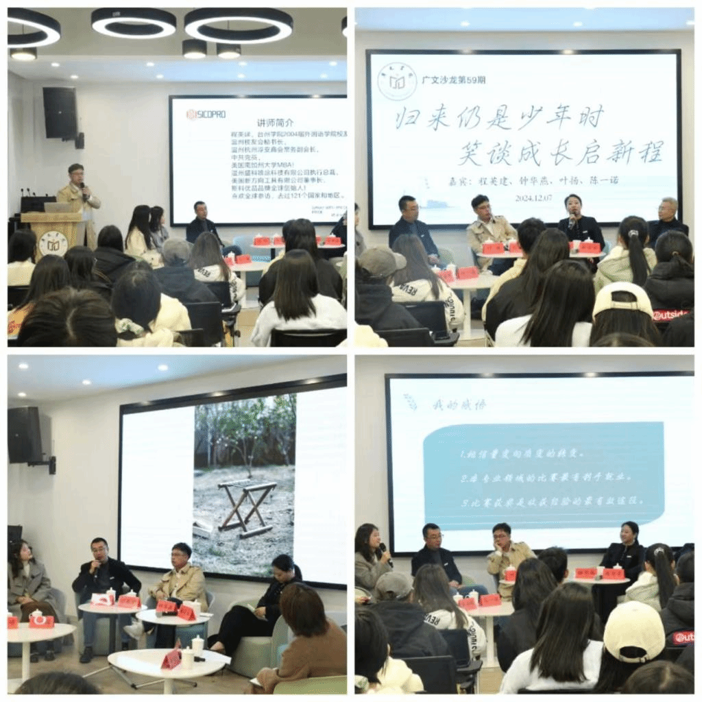 12月7日下午,广文书院在多功能厅举办了以“归来仍是少年时,笑谈成长启新程”为主题的沙龙活动。此次沙龙邀请了优秀校友程英建、钟华燕、叶扬、陈一诺担任主讲嘉宾,临海校区综合服务中心主任施安全、学工部副部长余伟峻、广文书院副院长金旭球和书院部分学生参与活动,书院学生高涵硕主持。