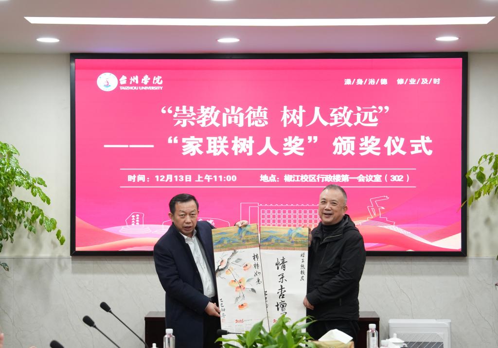 冬日暖阳映初心,尊师重教传温情。12月13日上午,台州学院2024年度“家联树人奖”颁奖仪式在椒江校区行政楼第一会议室举行。台州学院校长、党委副书记、校友总会会长乐传永,宁波家联科技股份有限公司董事长、原台州师专88届校友、台州学院宁波校友会会长王熊,台州学院党委委员、人事处处长郑丽君等出席仪式。仪式由台州学院副校长、党委委员、校友总会副会长李钧敏主持。